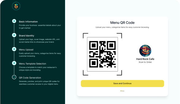 Sign up, fill in your restaurant details, and upload your menu items quickly and easily. No technical expertise required. Our support team is always available to assist you